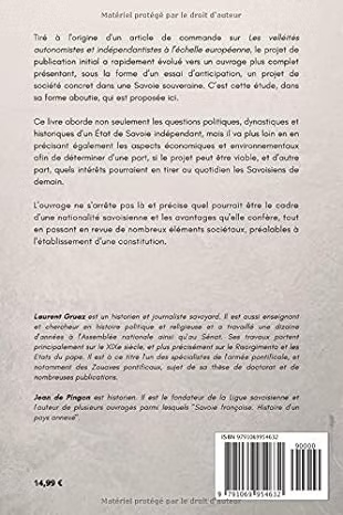 Résumé de l’ouvrage : II y a deux départements savoyards, mais il n’y a qu’une Savoie, celle de nos aïeux ». C’est ainsi que s’exprimait l’homme politique savoyard Antoine Borrel (1878-1961). Cette phrase, bien des Savoyards aimeraient l’entendre de la part de leurs élus représentant la Savoie à Paris. En effet, il y a 156 ans, la Savoie fut annexée par l’Empire français avec le comtat de Nice, soumettant soudainement les Savoyards et les Nissarts à la France, alors qu’ils avaient été souverains dans leur pays durant près d’un millénaire. La Savoie fut alors scindée en deux départements, tandis que Savoyards et Nissarts étaient désormais contraints de se plier aux règles et aux taxes d’une France qui, entre les XVIe et XVIIIe siècles, les avait violemment envahis à sept reprises. Leurs princes, issus de l’une des plus vieilles dynasties de l’Europe, la Maison de Savoie, avaient chaque fois réussi à les libérer de l’emprise française. Mais la huitième occupation leur fut fatale, car la politique nationaliste, bourgeoise et libre-échangiste, qui s’imposa dès le XIXe siècle, décida brutalement de leur sort, et fit basculer Savoyards et Nissarts dans le « ventre » de la France, le 14 juin 1860. Cette Histoire de la Savoie n’est pas une histoire traditionnelle : il s’agit d’une Histoire de la Savoie du point de vue de la Savoie. Cette approche, aussi novatrice que considérable, est le fruit d’une vingtaine d’auteurs, majoritairement des historiens, mais pas seulement, on compte également des avocats, des juristes, etc., tous amoureux de leur pays… et tous ont oeuvré à retracer l’histoire méconnue de la Savoie.